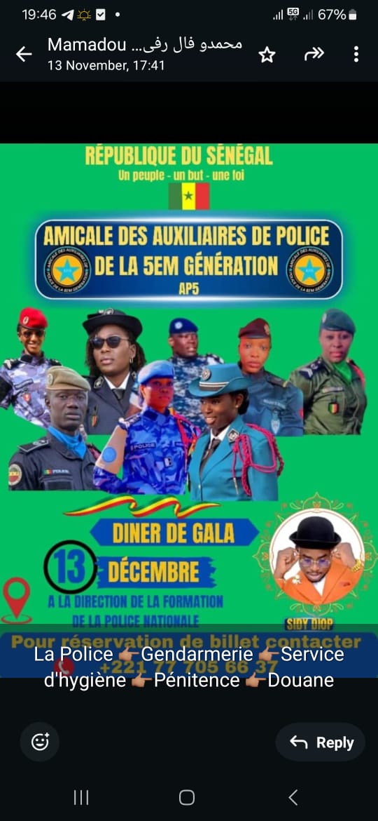 آقای عسگری سفیر جمهوری اسلامی ایران بنا به دعوت رئیس آکادمیپلیس سنگال در تاریخ 12 آذرماه در مراسم جشن فارغ التحصیلی پلیس سنگال به عنوان مهمان افتخاری این مراسم شرکت کرد. در این مراسم معاون وزیر کشور و معاون وزیر انرژی و همچنین رئیس آکادمی و دانش پژوهان به همراه خانوادههای آنان حضور داشتند. در این مراسم از افراد برجسته تقدیر بعمل آمد. سفیر کشورمان در حاشیه این مراسم با رئیس آکادمیپلیس نیز دیدار و گفتگو کرد و ضمن معرفی دانشگاه امین پلیس، بر آمادگی ایران برای همکاری بویژه در حوزه آموزشی اعلام گردید.