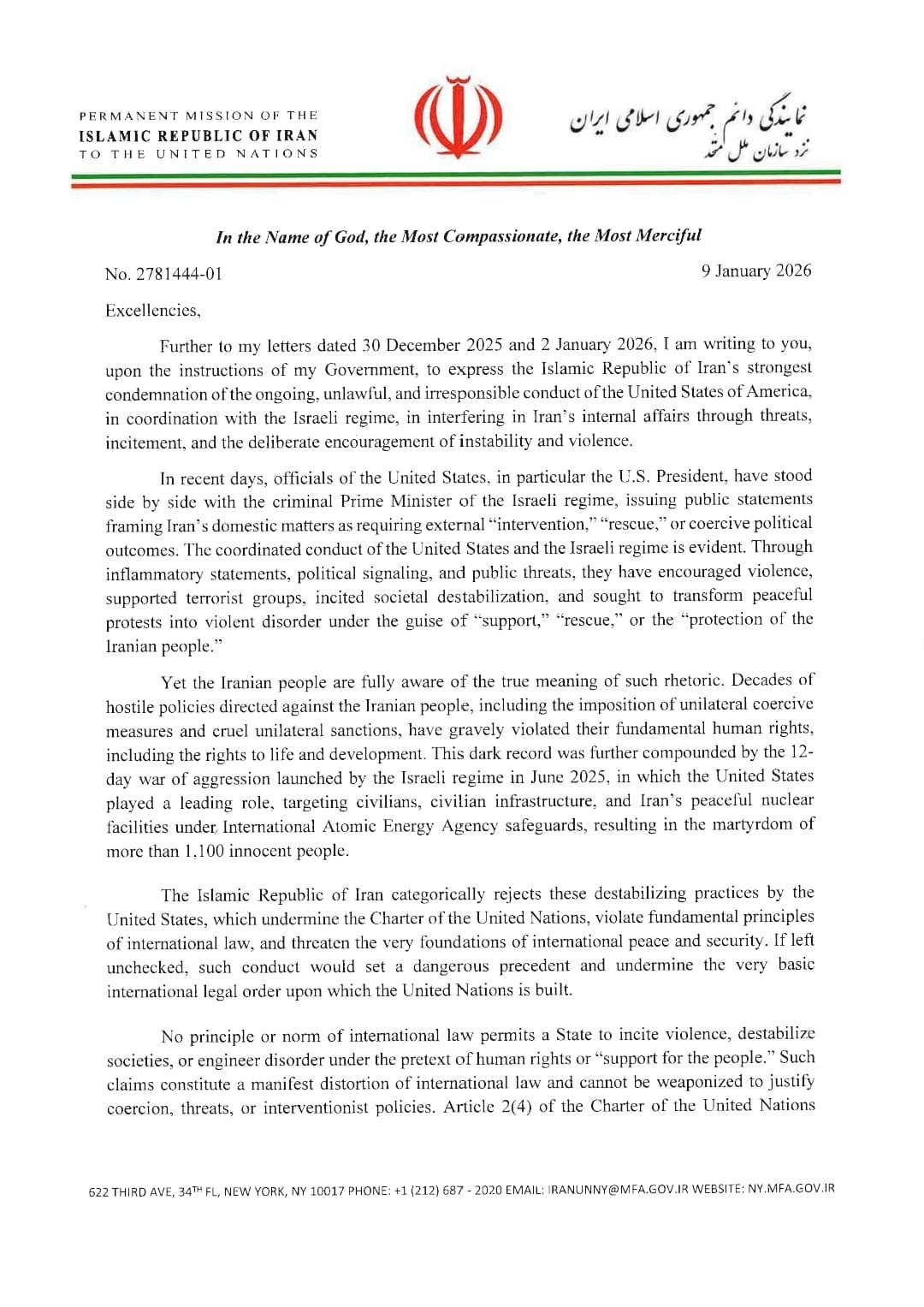نامه نمایندگی دائم جمهوری اسلامی ایران نزد سازمان ملل متحد خطاب به دبیرکل سازمان ملل متحد و رئیس شورای امنیت به تاریخ ۹ ژانویه ۲۰۲۶ در خصوص تحولات اخیر (دی ماه) ایران.