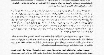 En cette heure où s’ouvre une grande épreuve de l’Histoire, les forces armées de la République islamique d’Iran, s’inspirant du vaste héritage héroïque de cette terre, s’en remettant à Dieu Tout-Puissant, croyant en la promesse de la victoire divine et s’appuyant sur la puissance nationale, n’hésiteront pas à défendre courageusement notre chère patrie.